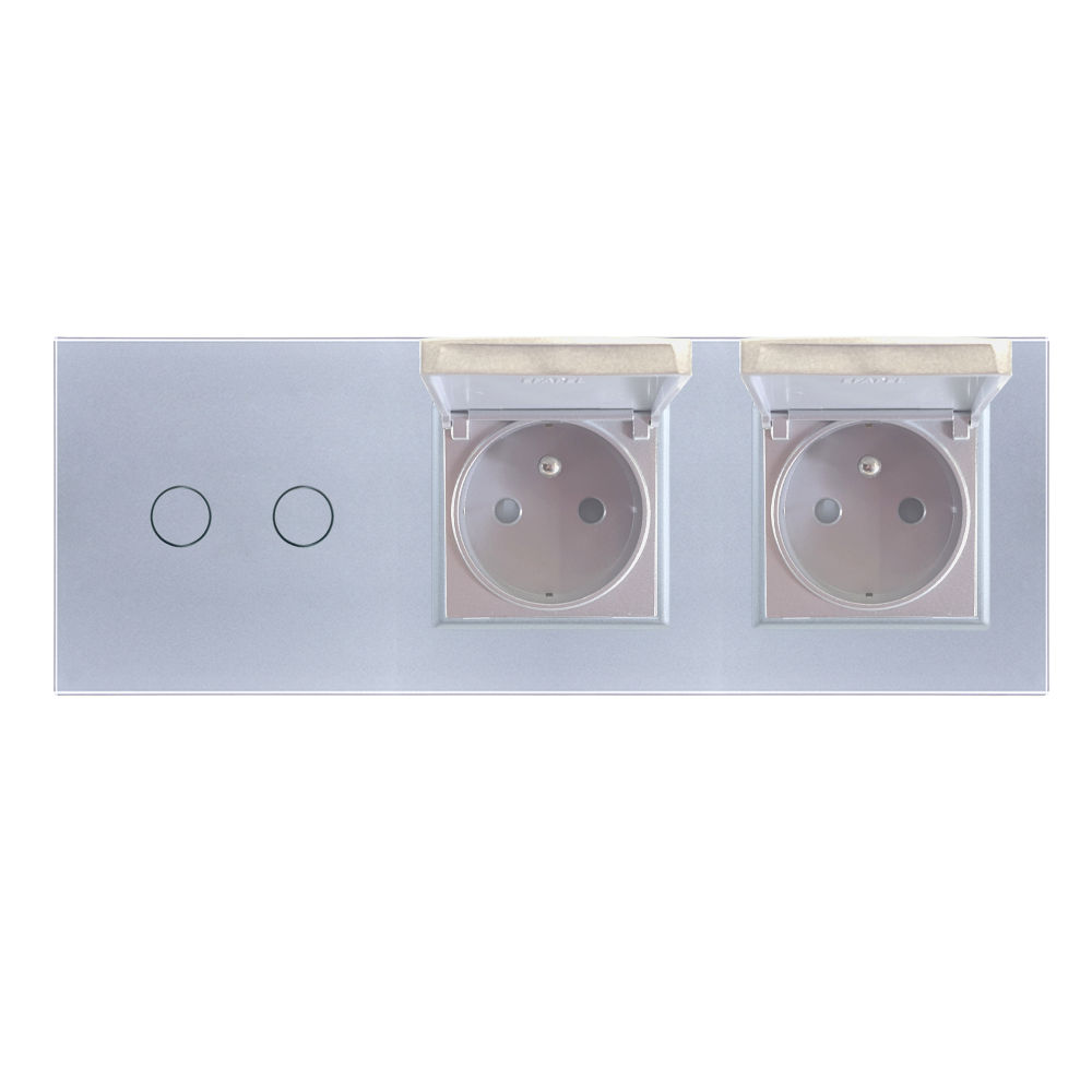 Panele i ramki szklane. Występują w konfiguracjach od jednej do pięciu puszek elektrycznych. Można je montować w pionie i poziomie. W ofercie znajdują się cztery kolory: BIAŁY, CZARNY, IVORY, SZARO-SREBRNY. Wykonane są z kryształowego szkła hartowanego o grubości 4mm! Występują jako panele szklane, ramki szklane oraz panele hybrydowe – połączenie włączników oraz gniazdek i akcesorii.